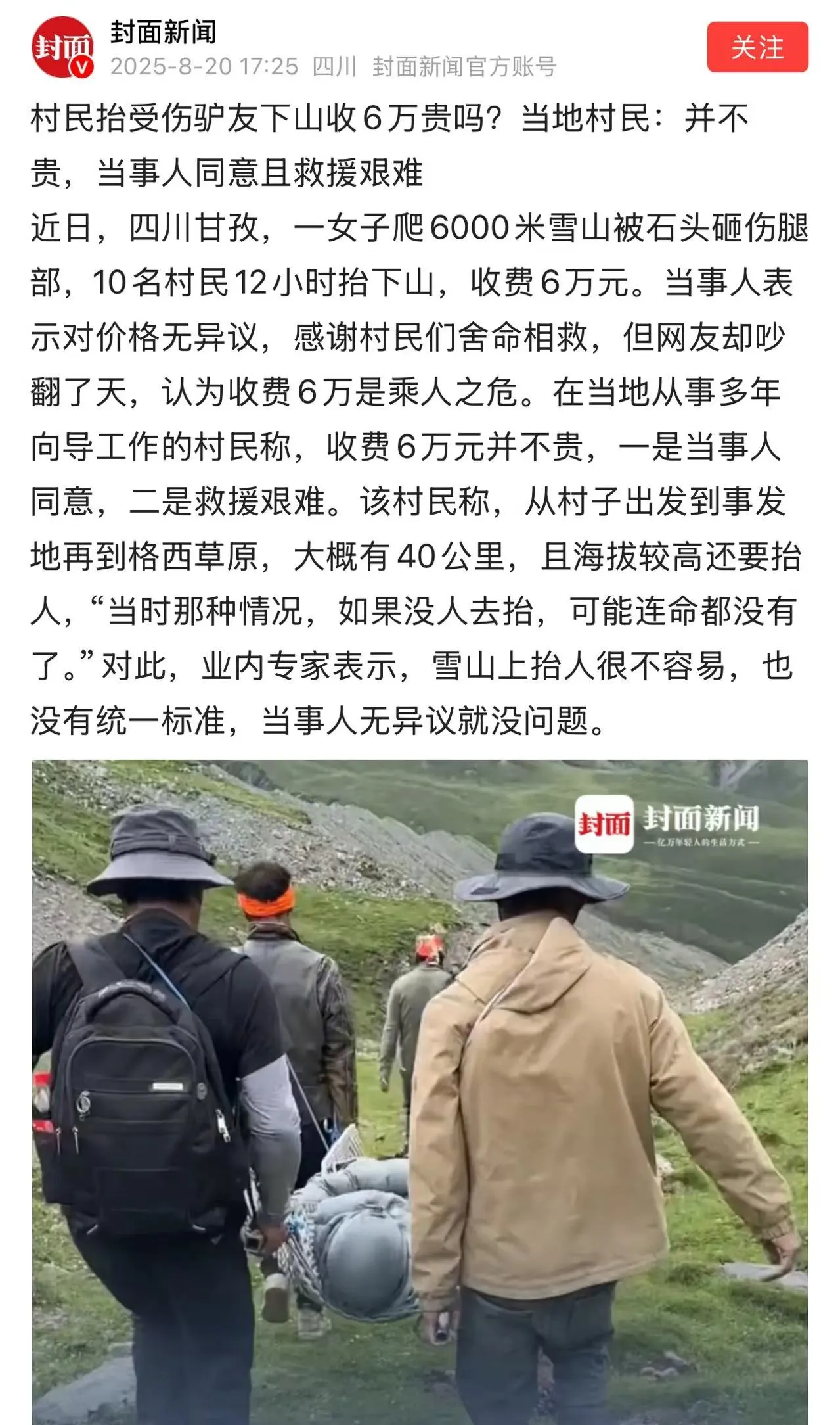 给我整笑了!四川甘孜,村民抬受伤驴友下山,收费6万,当事人对价格无异议,还感谢村民们舍命相救,可网友却吵翻了,认为收费6万是乘人之危,趁火打劫!还有人说,做好事不能收钱,收钱就变味了!