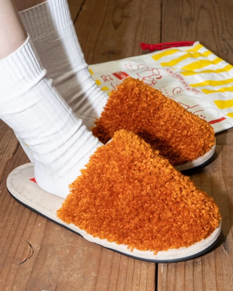 你是去日本就必吃全家炸鸡的人吗?如果你是,那这双日本全家FamilyMart与生活品牌Miyoshi Rug合作推出的绝对会让你尖叫,鞋面用了毛绒布料去模拟炸鸡酥脆的外皮,颜色更是带点焦糖感的浓金黄,看起来就像刚炸好的香嫩鸡排,还搭配了黄白条纹的专属收纳袋,就像你提着刚买好的炸鸡回家一样,幽默实用都满分。